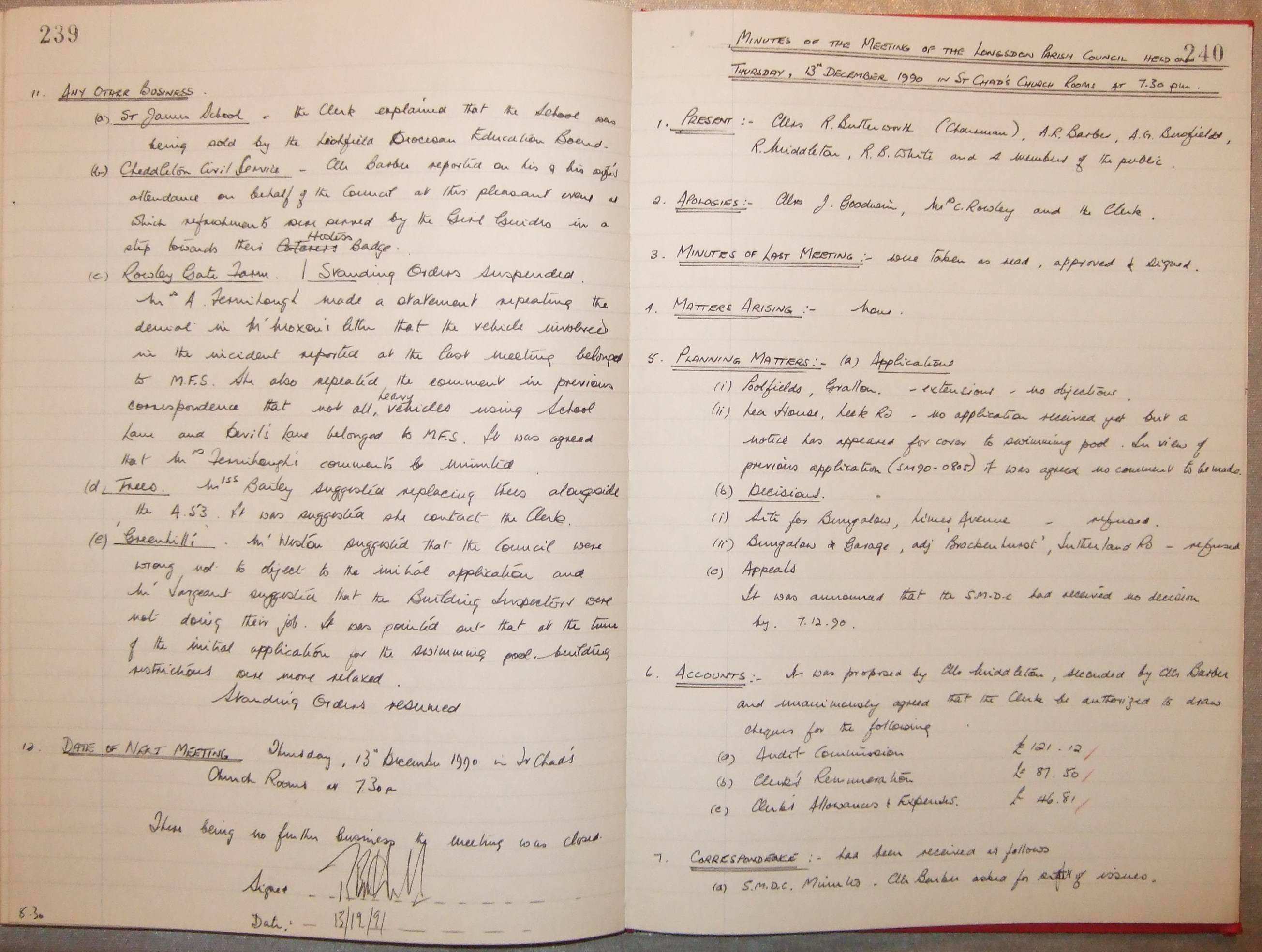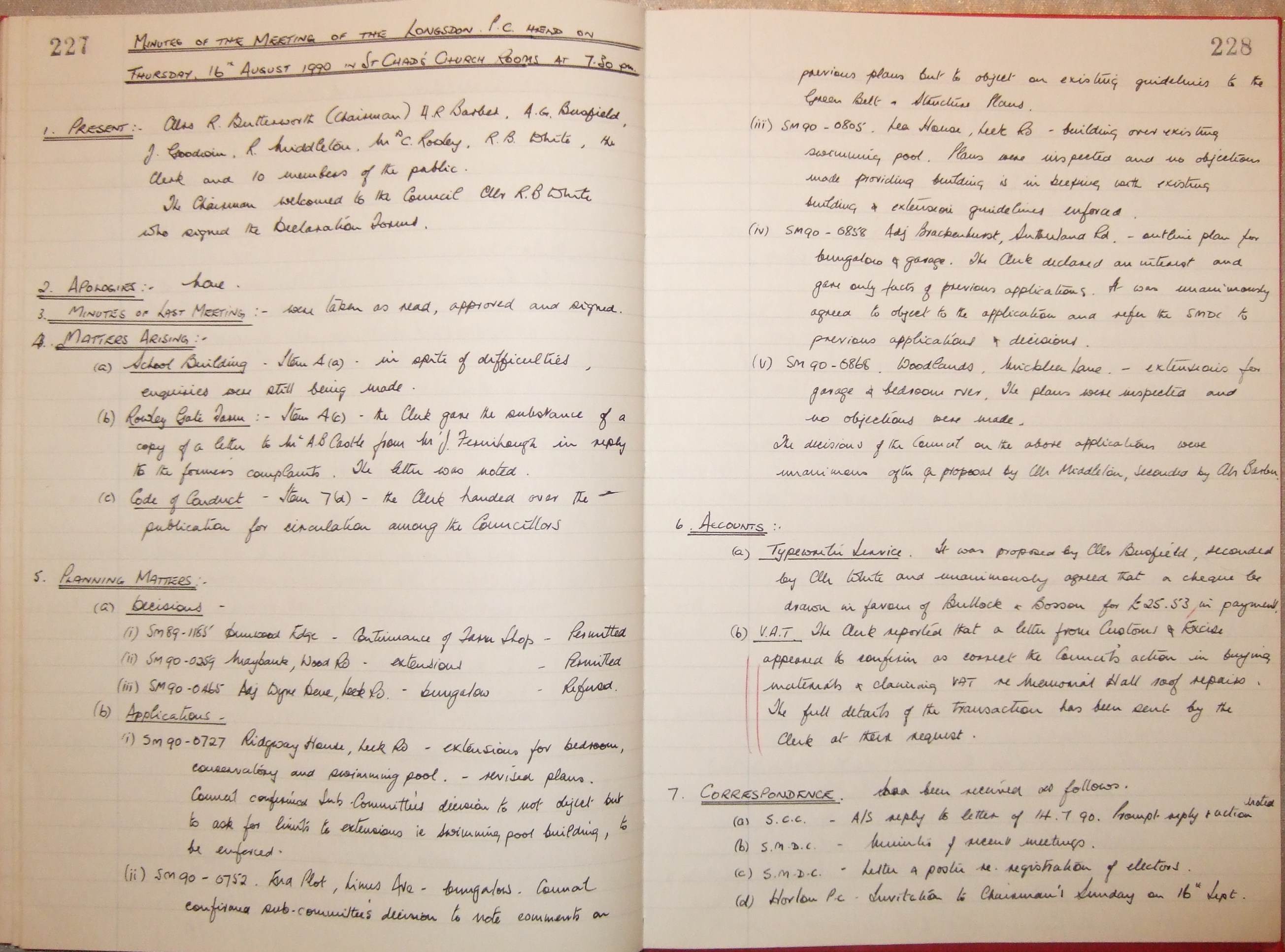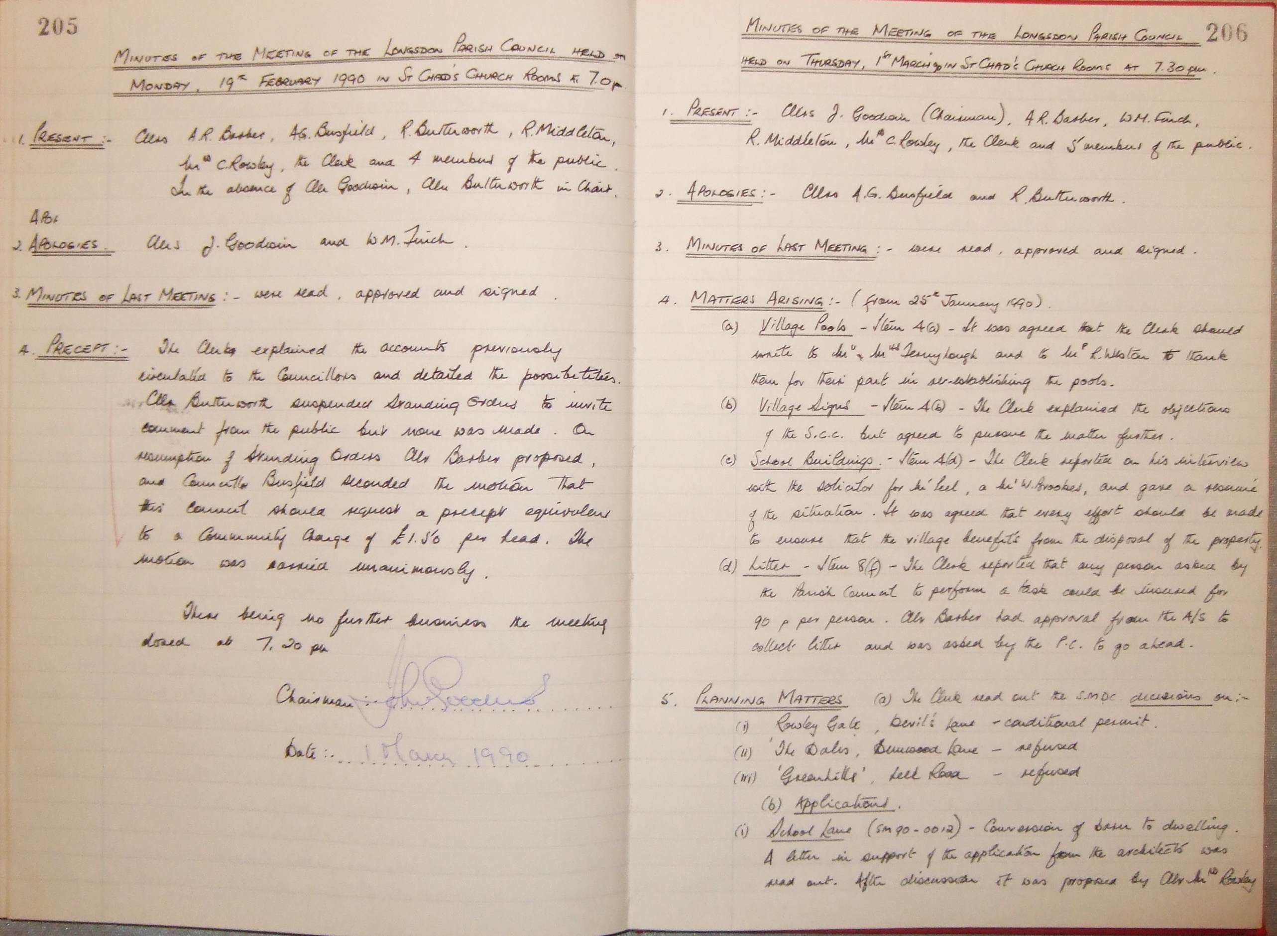Photographs of pages from the Parish Council Minute book for meetings from 1990.