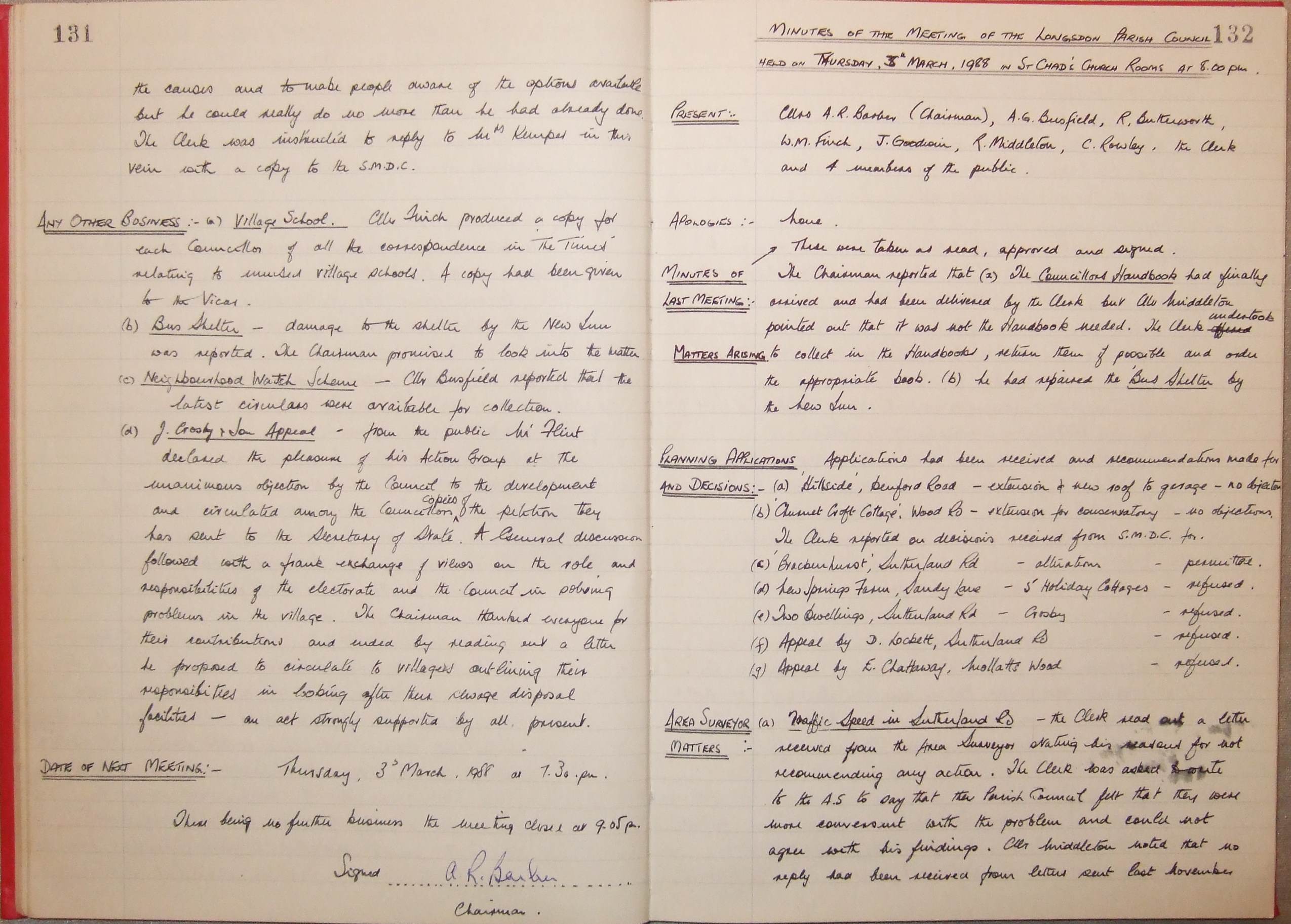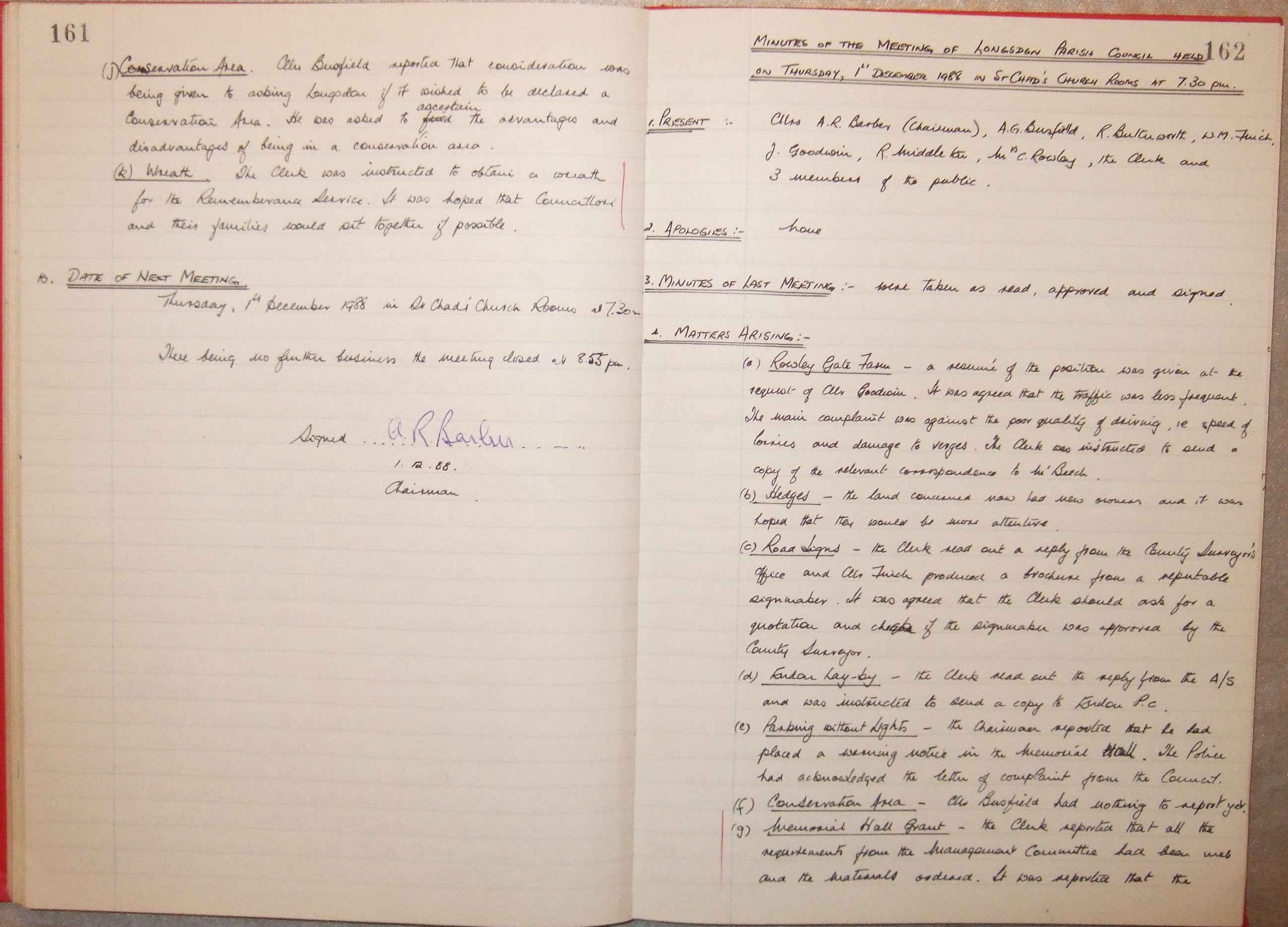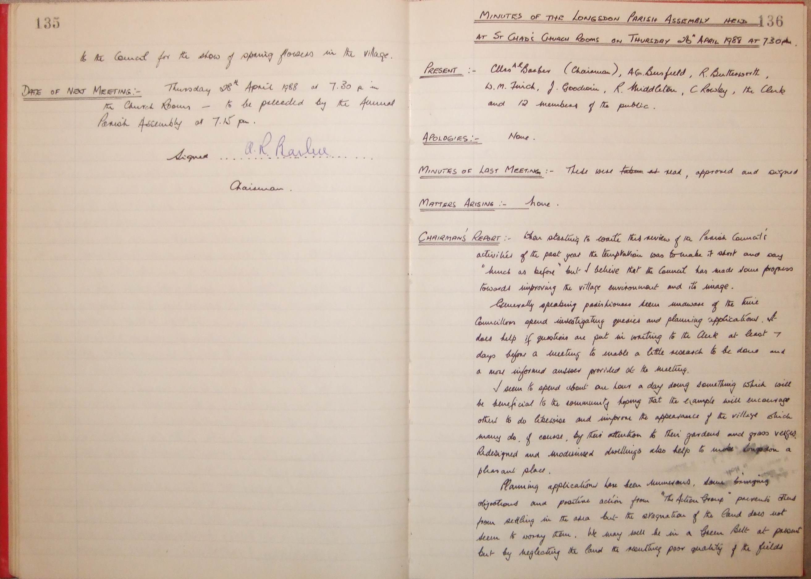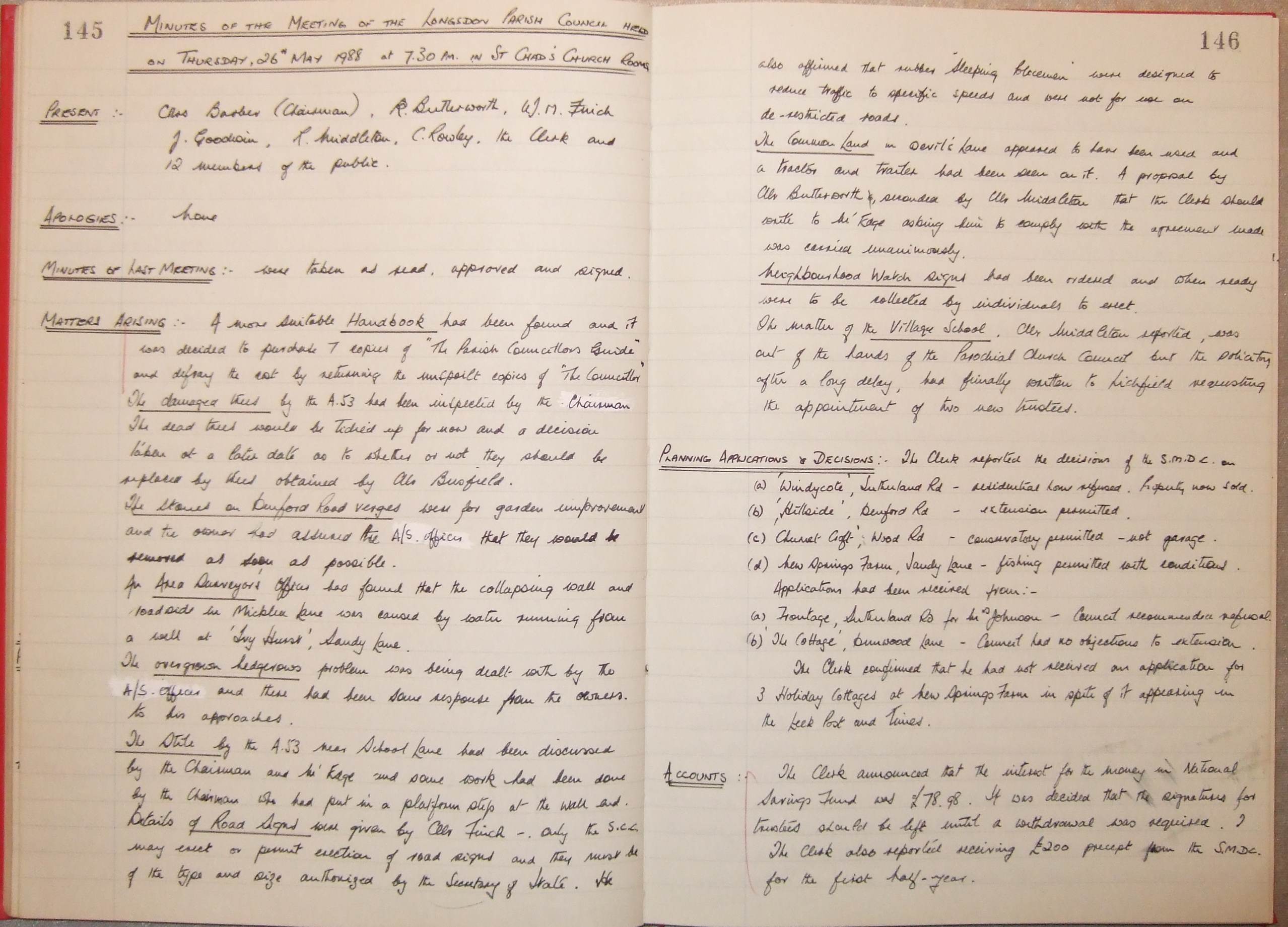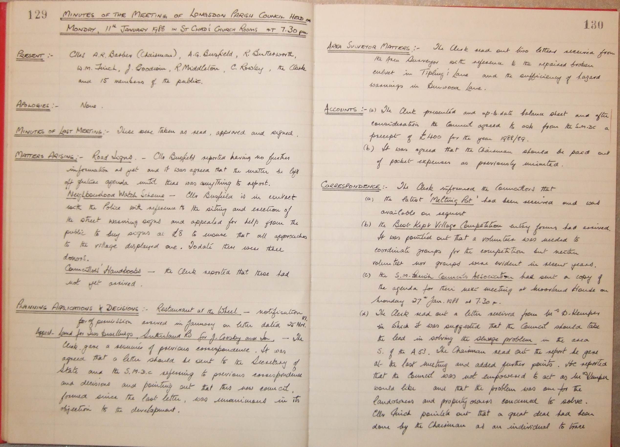 Photographs of pages from the Parish Council Minute book for meetings from 1988.