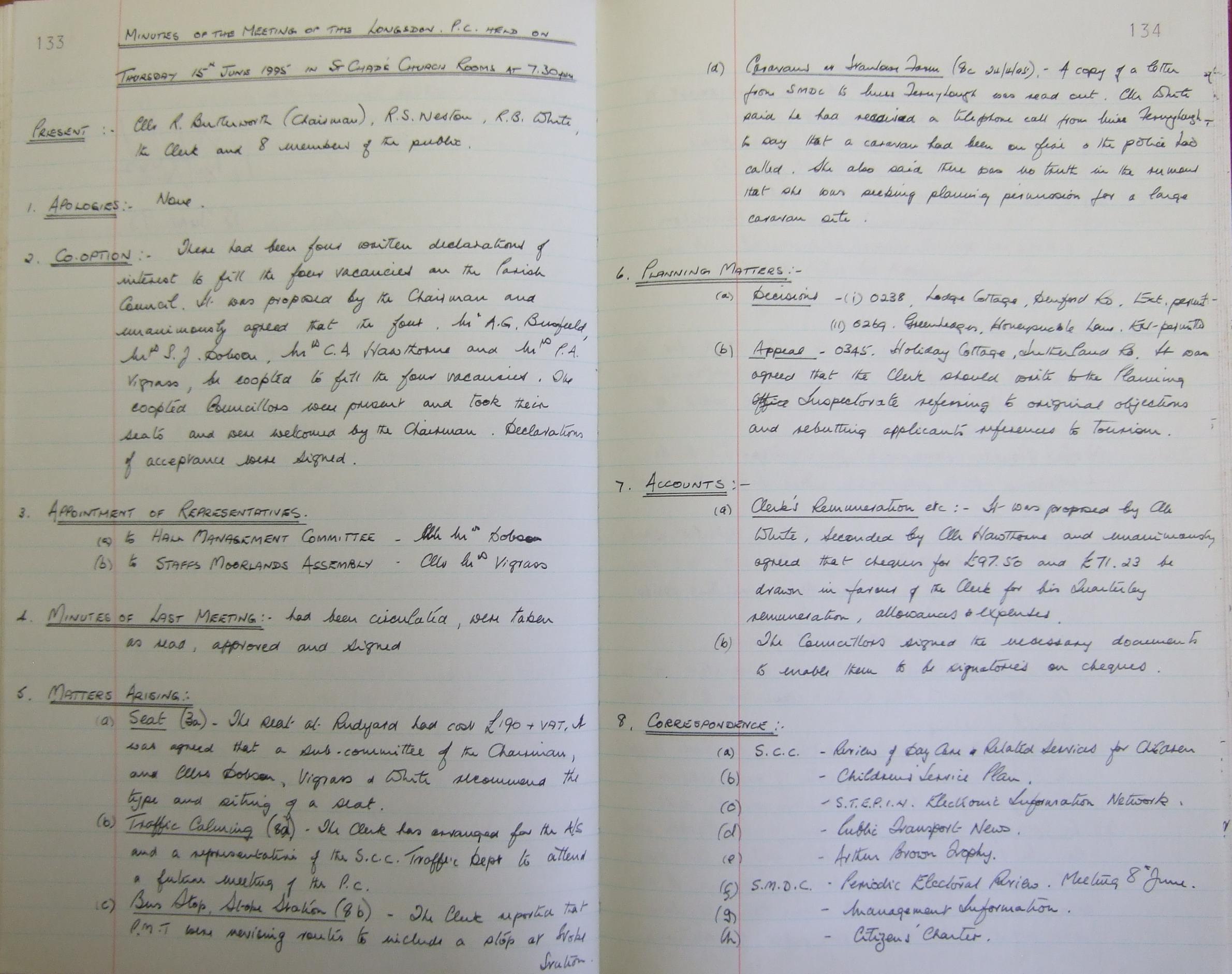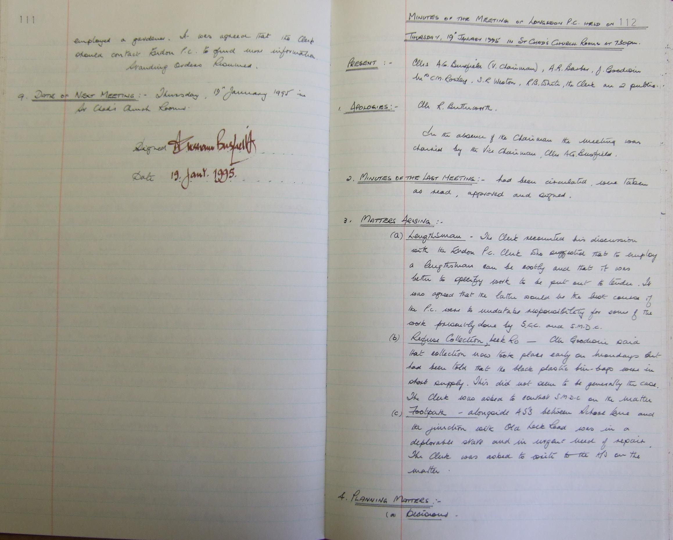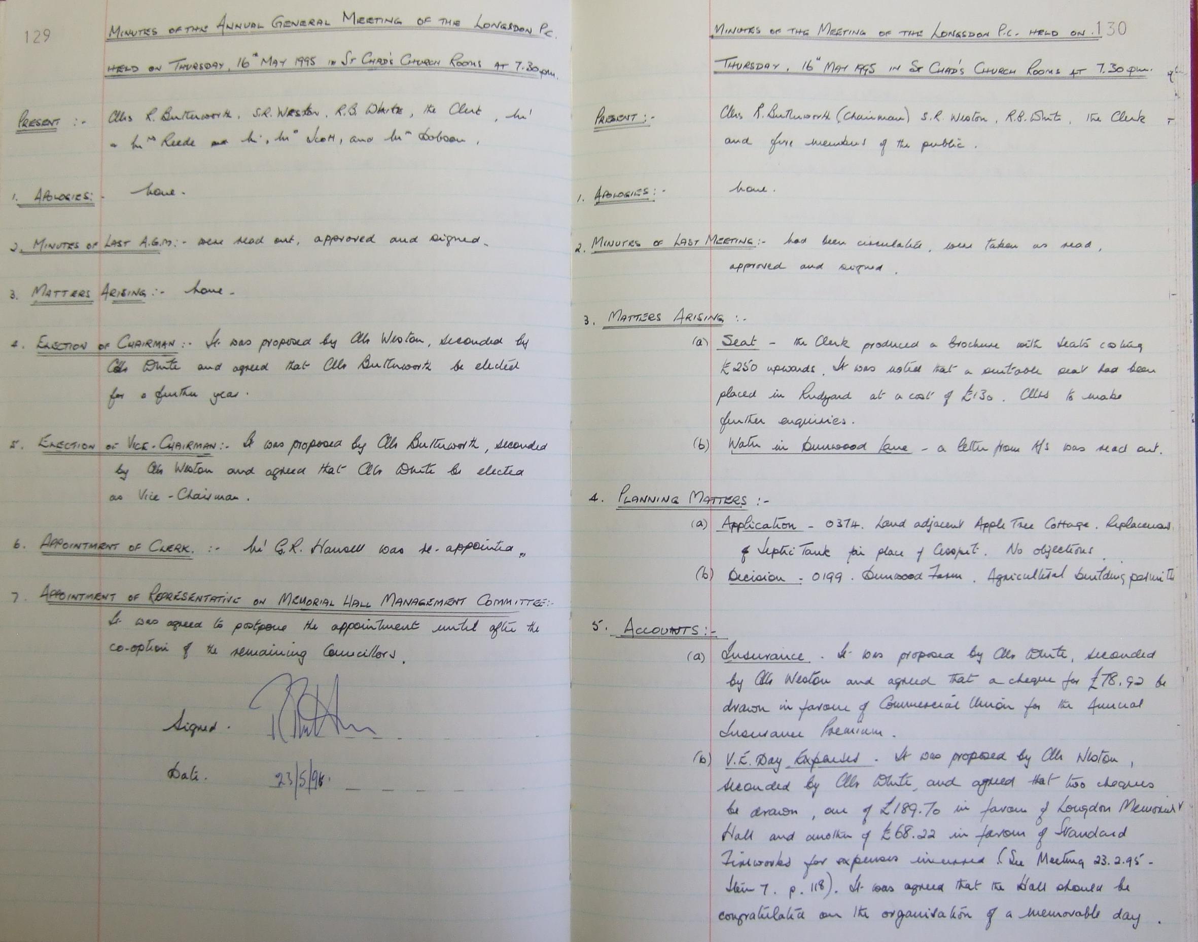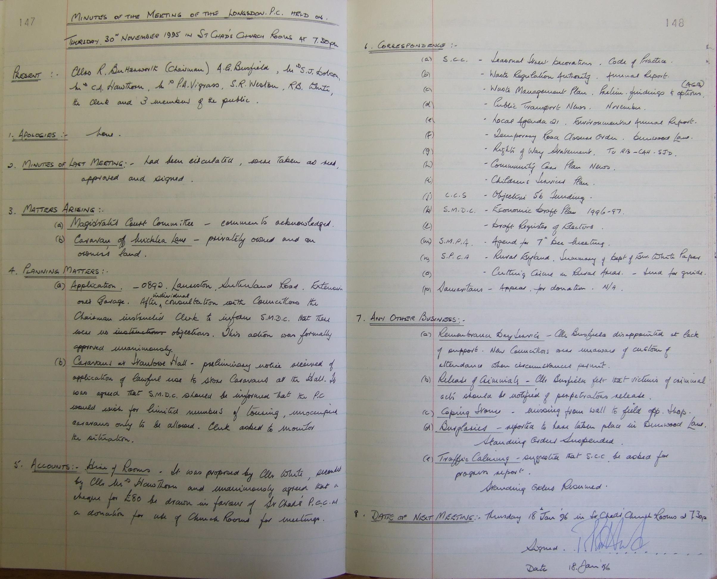 Photographs of pages from the Parish Council Minute book for meetings from 1995.