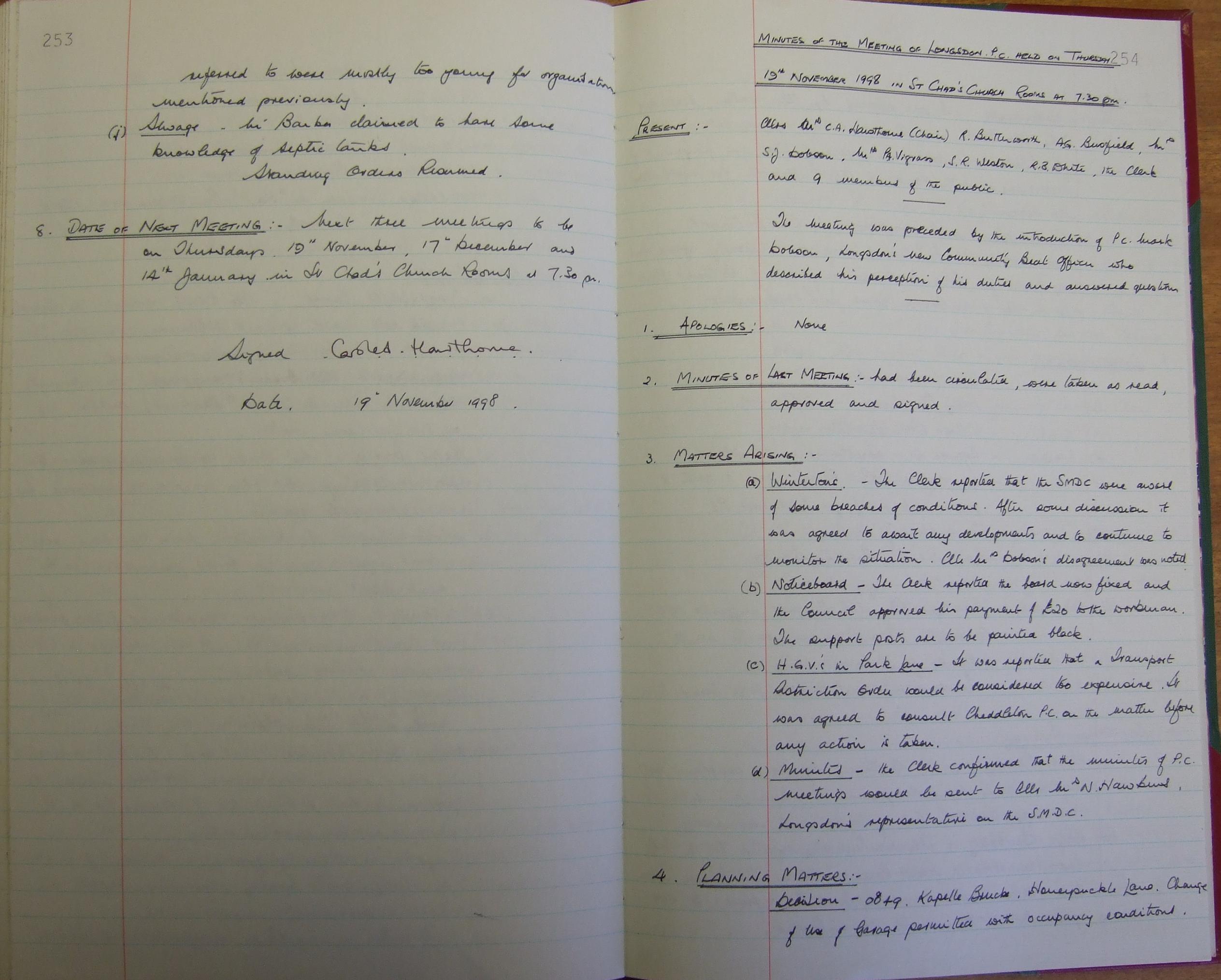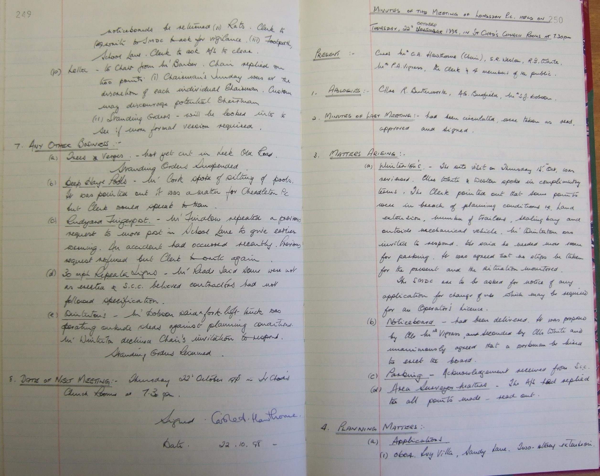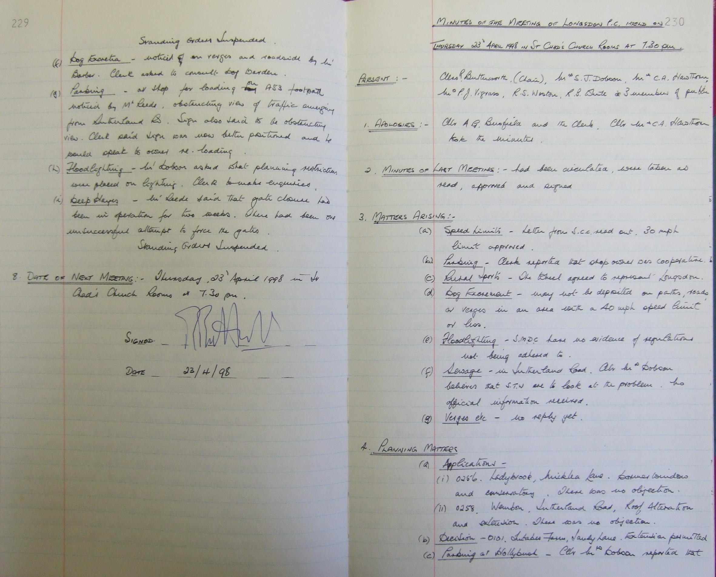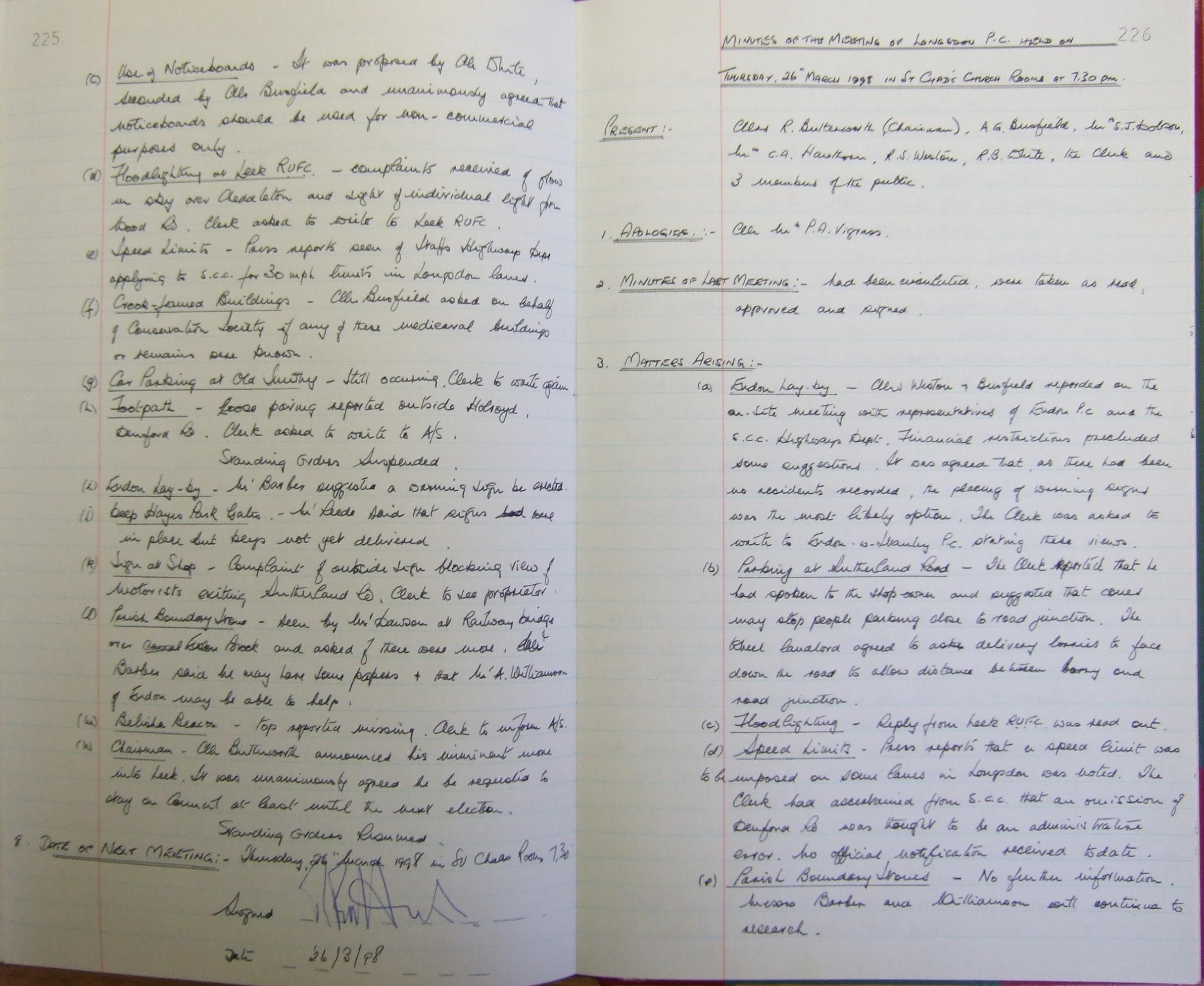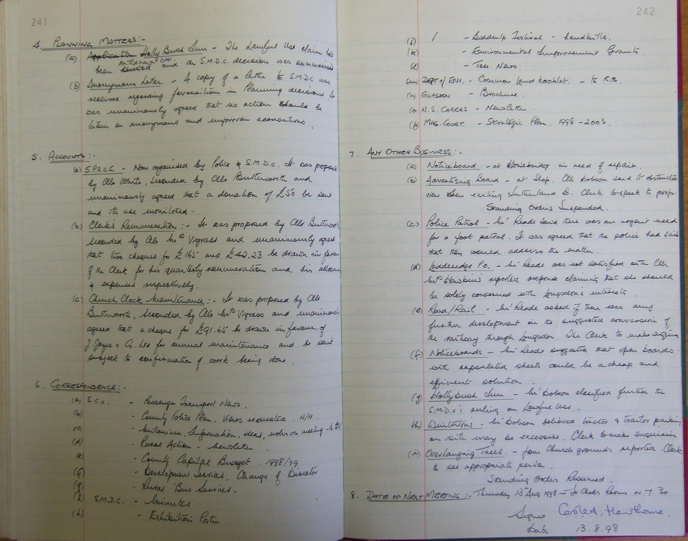 Photographs of pages from the Parish Council Minute book for meetings from 1998.