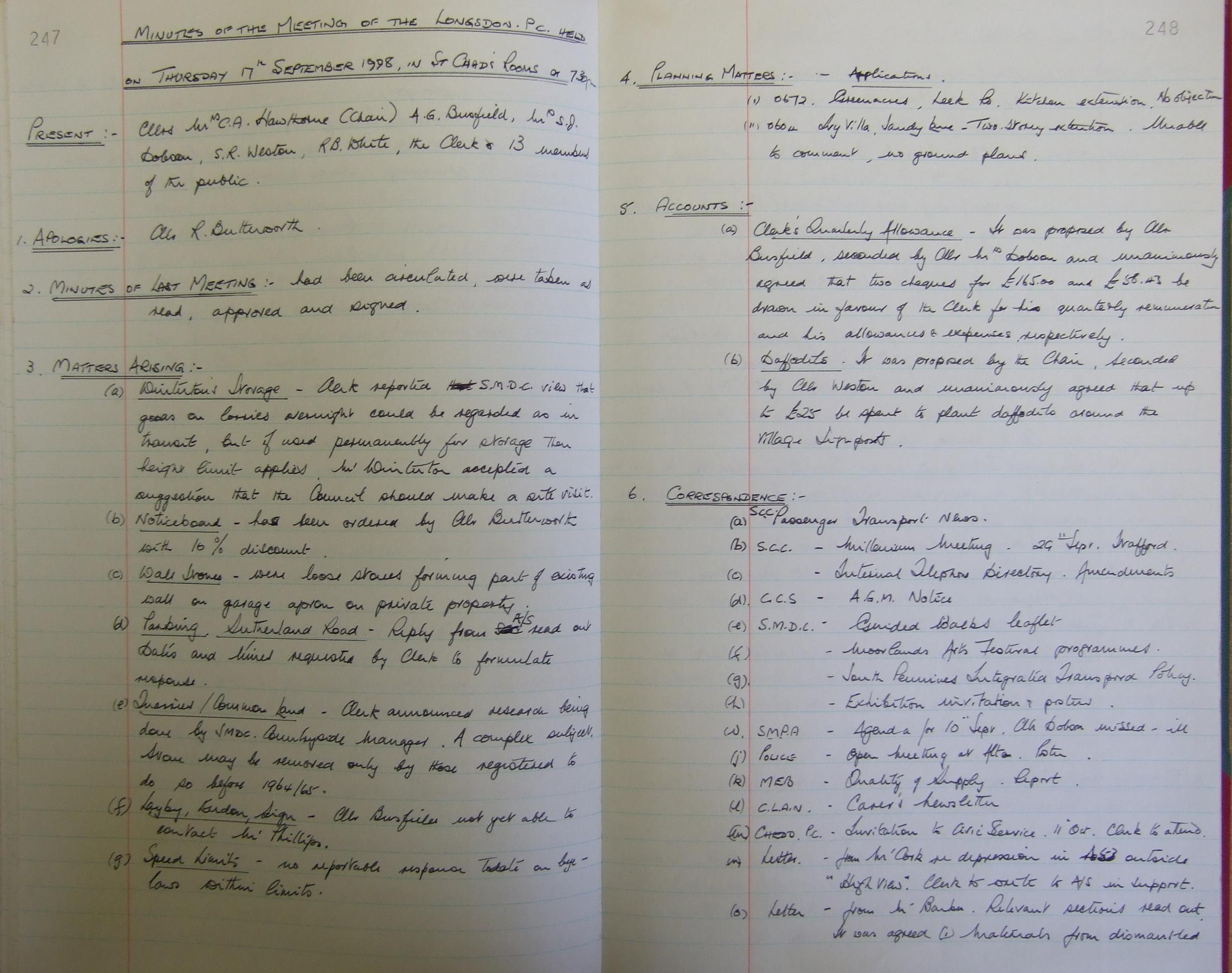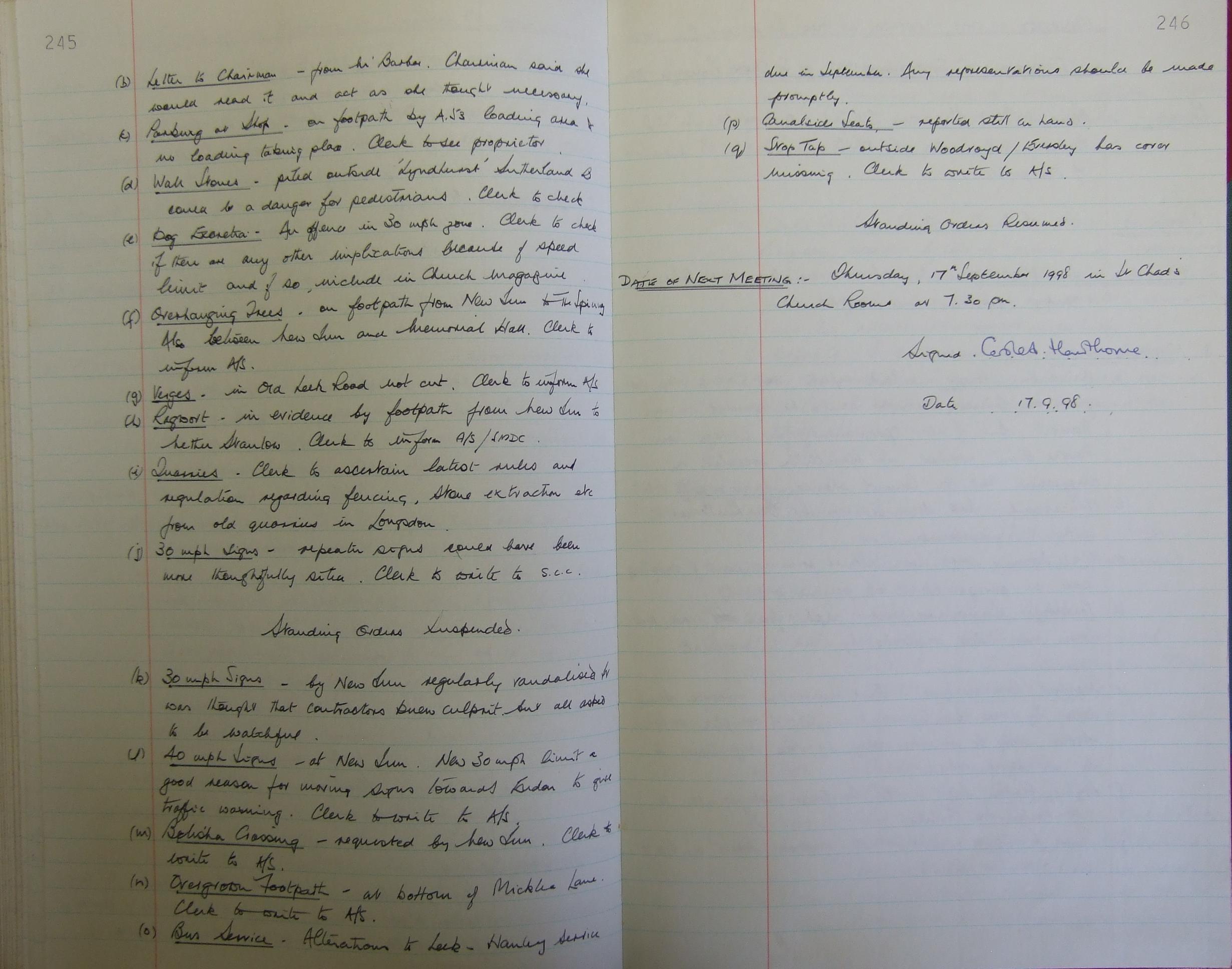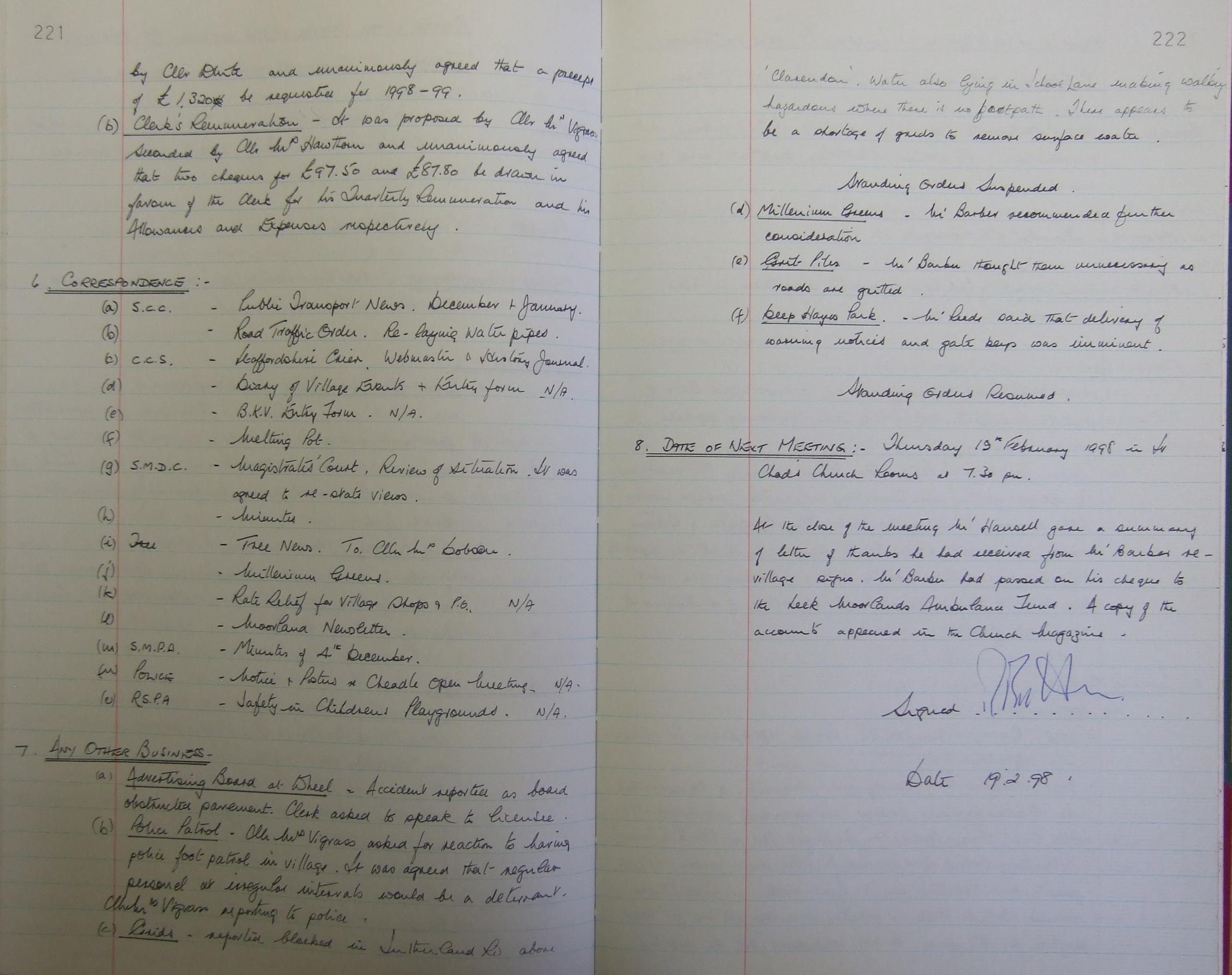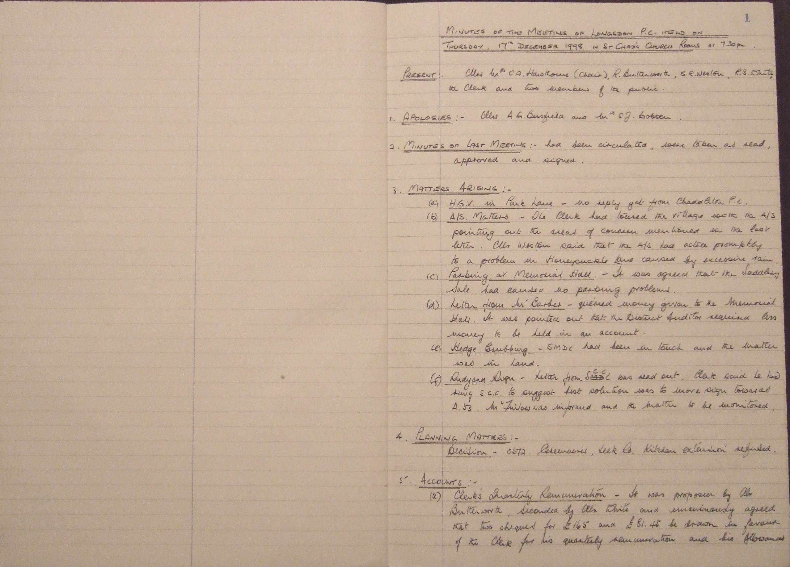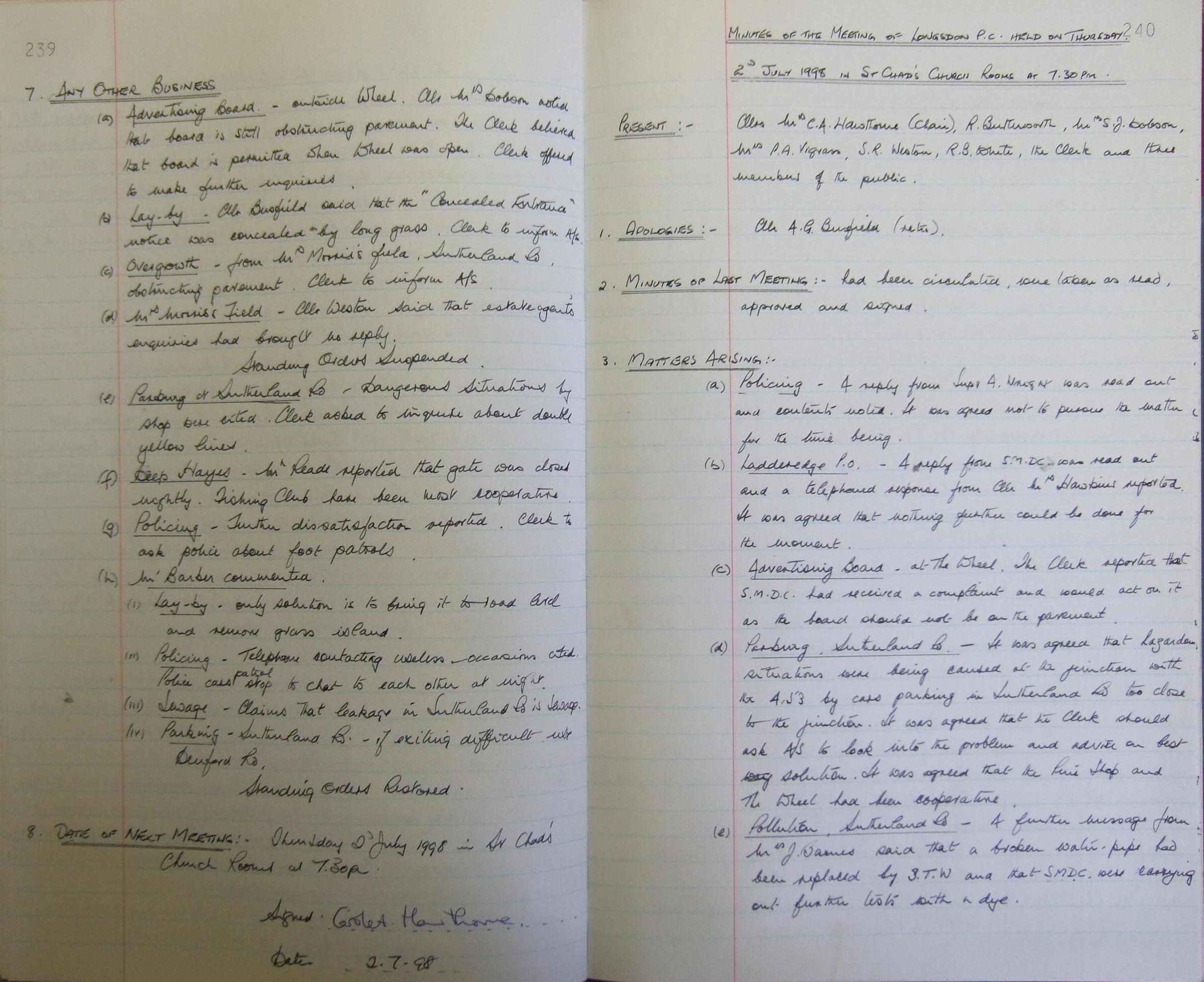 Photographs of pages from the Parish Council Minute book for meetings from 1998.